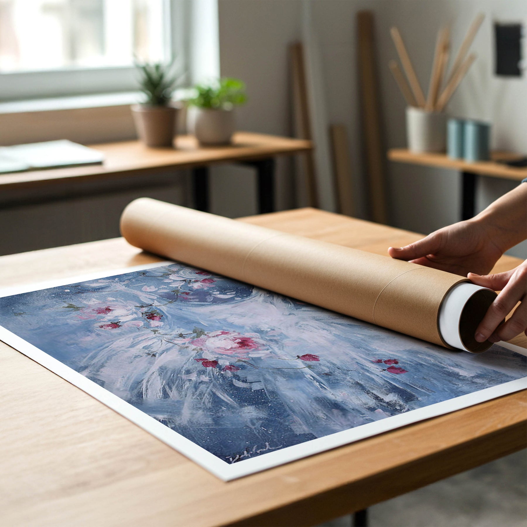 Person rolling a shabby-chic fine art print of a ballet painting to place in a cardboard mailing tube.