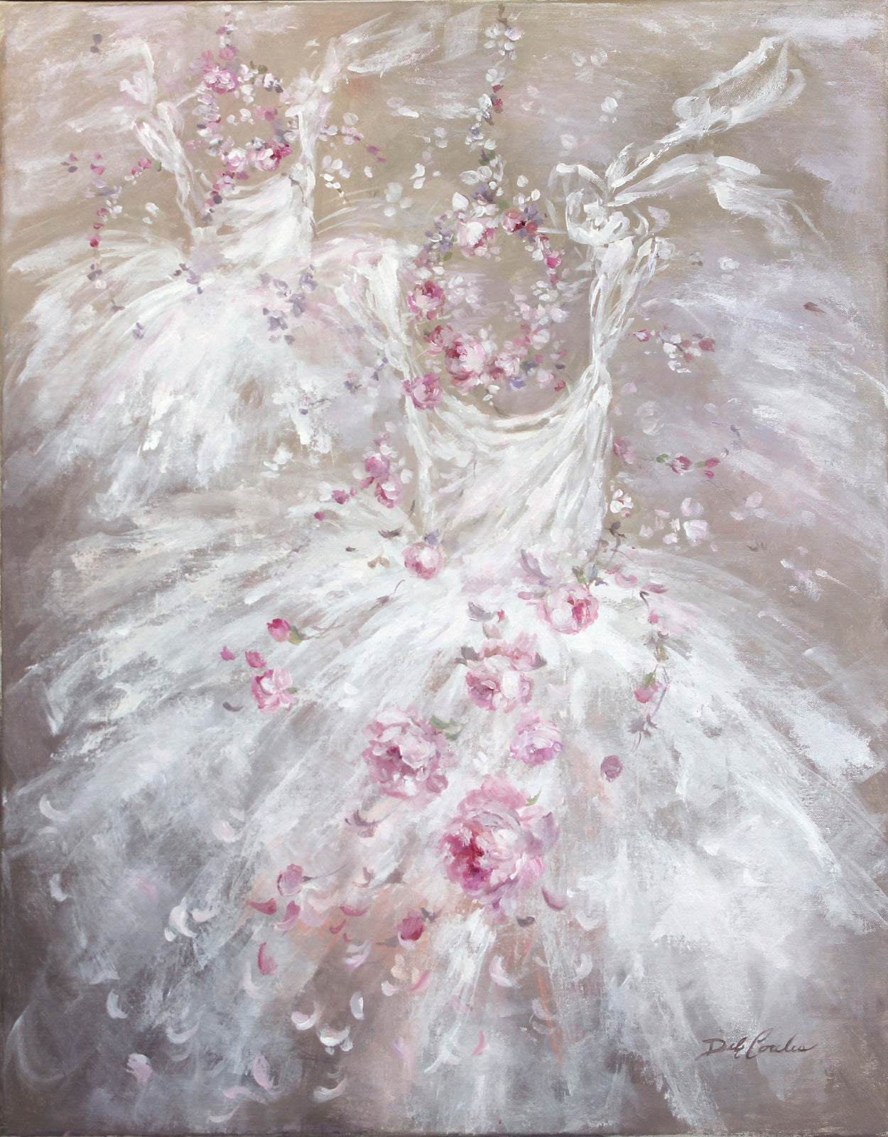 Abstract painting of two white tutu dresses dancing across a canvas of pinkish tan. Pink Roses make crowns for both and are wrapping around the tutus and flying everywhere.