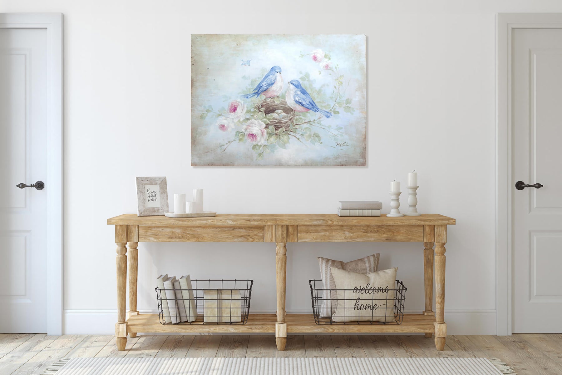 A canvas print of two bluebirds nesting among blooming roses. The print hangs in a hallway above a wooden entry table.