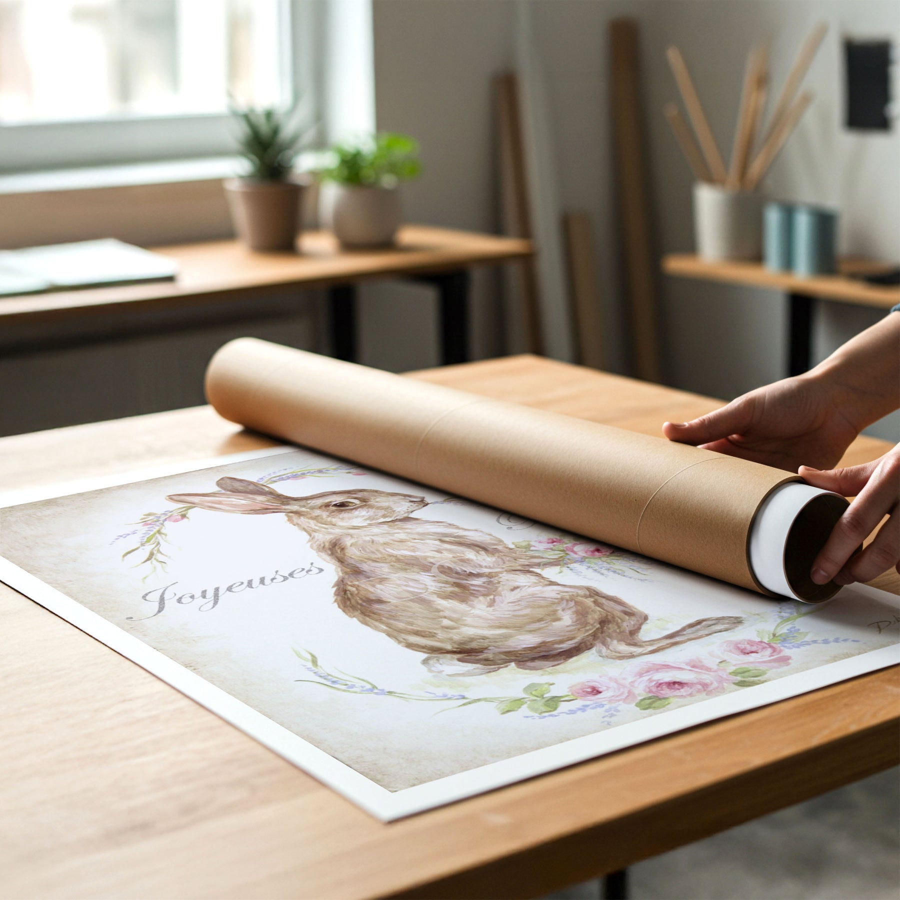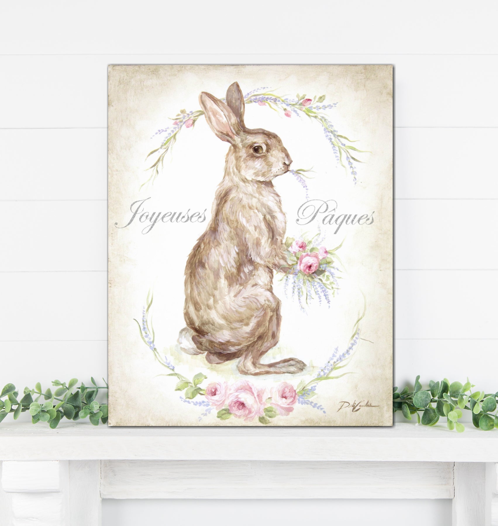 Oh, to be in France for Easter! But wherever you may be, there is no better way to add a touch of French-chic to your Easter than with this beautiful giclee print of "Joyeuses Paques" (French for "Happy Easter"). This original Easter artwork features an adorable bunny holding a lovely bouquet of pink roses and lavender. Perfect for adding just the right touch of shabby-French-chic to your Easter decor.