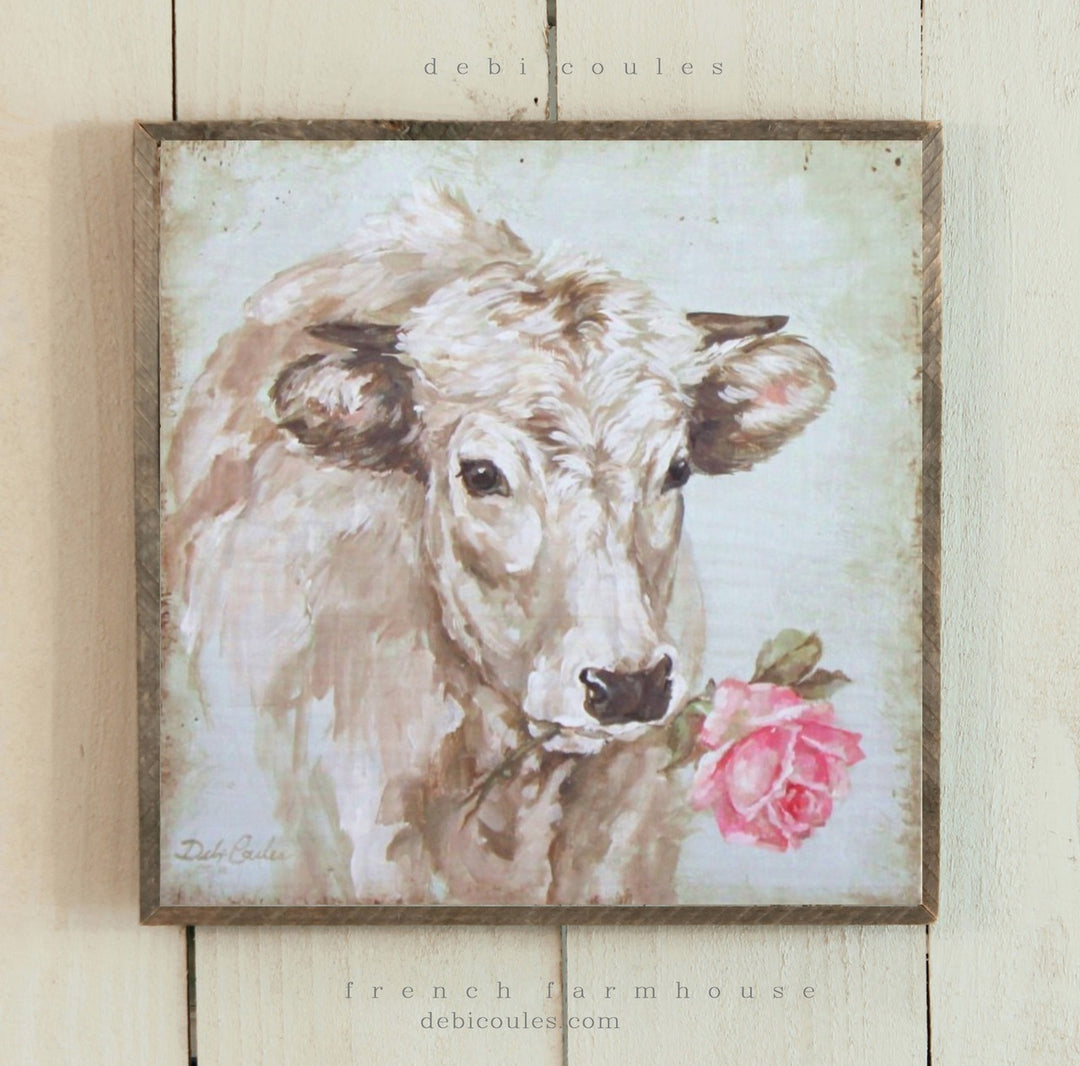 I love all animals, but cows have a special place in my heart. Years ago, I spent a week on a cattle ranch, and became completely enamored with the cows. They are such beautiful animals with their mournful eyes, long eyelashes, and gentle demeanor. They yearned for affection and loved to be petted! At dinner time, they all came running together with their families. And so it's not that difficult for me to add in a touch of romance with these rustic creatures because it's how I have come to see them.