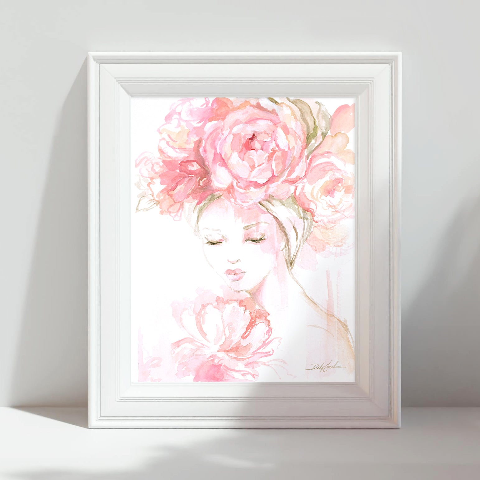 My professional path as an artist began in fashion illustration. While I am best known for my iconic shabby-chic pink florals, my heart often drifts back to watercolor fashion. “Blush Whisper” is part of my new six-piece Flower Girl series, where fashion-inspired elegance meets romantic florals. Painted in blush—a soft, airy shade of pink—the watercolor florals bloom delicately across the composition, creating a gentle, feminine mood. The piece captures a quiet moment of grace and beauty, evoking softness, romance, and timeless charm.