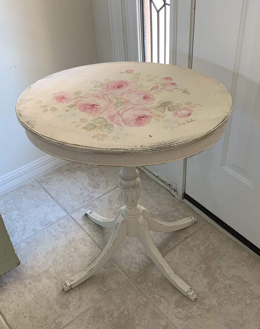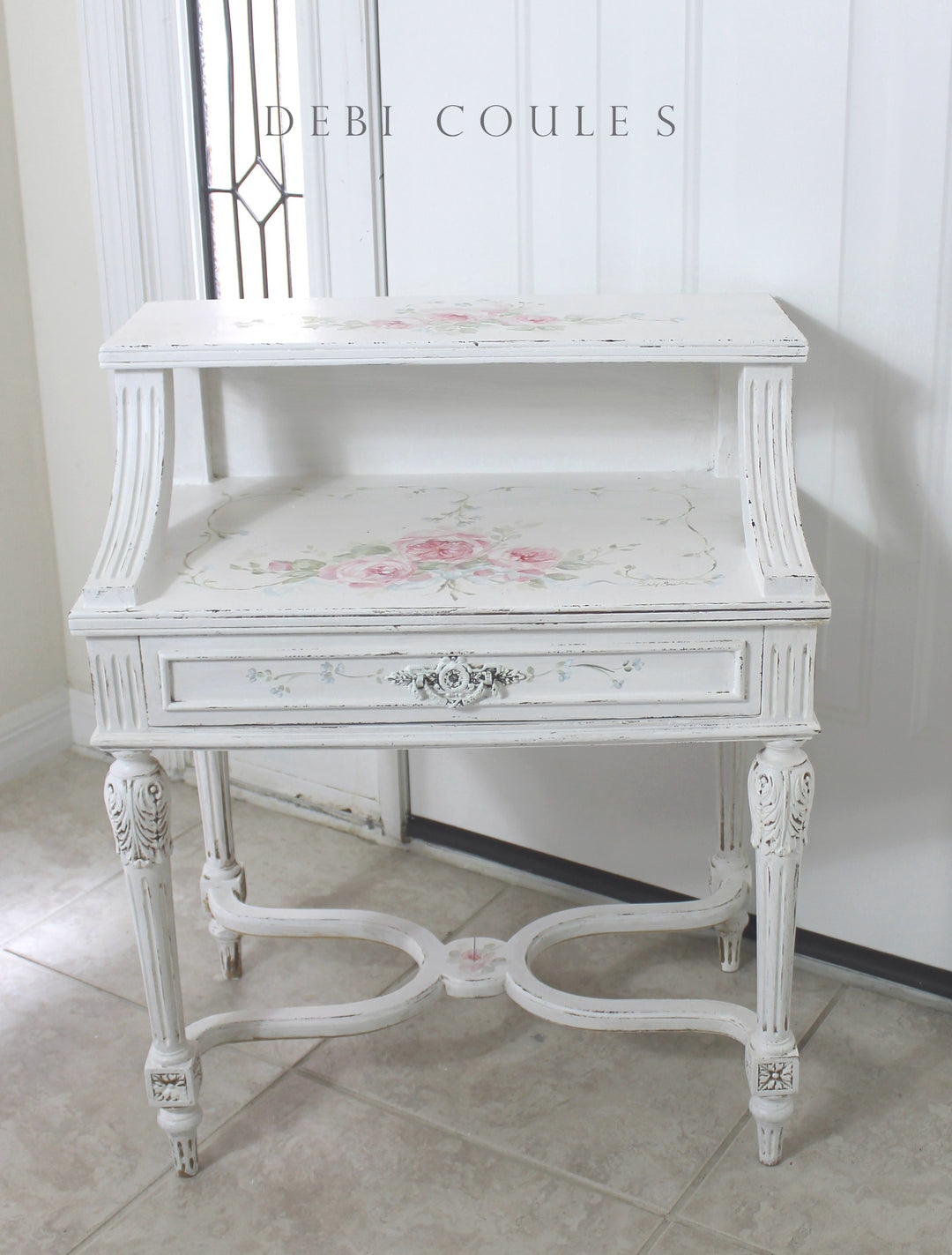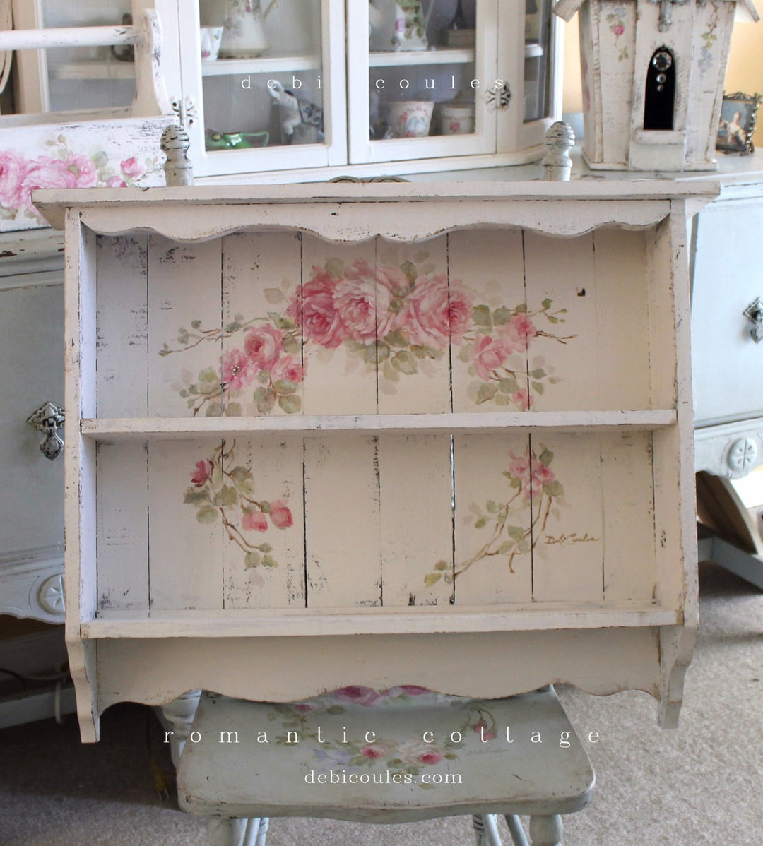 Moving beyond the traditional canvas, Debi hand-painted vintage chic bedroom, entryway or shabby home furniture are breath-taking originals. Debi's vintage chic bedroom, entryway or shabby home furniture are originals and in a class of their own. Vintage furniture is hand-painted in a shabby chic style with breathtaking impressionist floral settings and landscapes, roses, lavender, lilac, peonies, and hydrangeas.